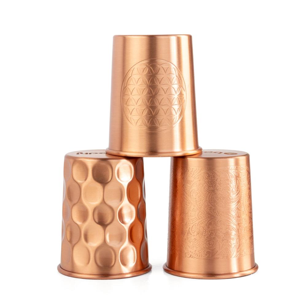 Im Ayurveda werden Kupferbecher seit jeher aufgrund ihrer gesundheitsfördernden Eigenschaften geschätzt. So soll Kupferwasser laut ayurvedischer Lehre die drei Doshas (Vata, Pitta und Kapha) ins Gleichgewicht bringen, das Immunsystem stärken, den Alterungsprozess verlangsamen, das Gehirn stimulieren und als natürliches Antioxidant wirken. Darüber hinaus sind Kupfer Trinkbecher eine umweltbewusste, federleichte und besonders langlebige Alternative zu Plastikbechern und To-Go-Einweggeschirr. Das macht sie zum idealen Begleiter für einen gesunden Lebensstil im Büro, Zuhause, beim Yoga, Workout oder auf Reisen. Unser Tipp: Kombiniere deinen Kupferbecher mit einer Kupfer Trinkflasche aus unserem Sortiment!